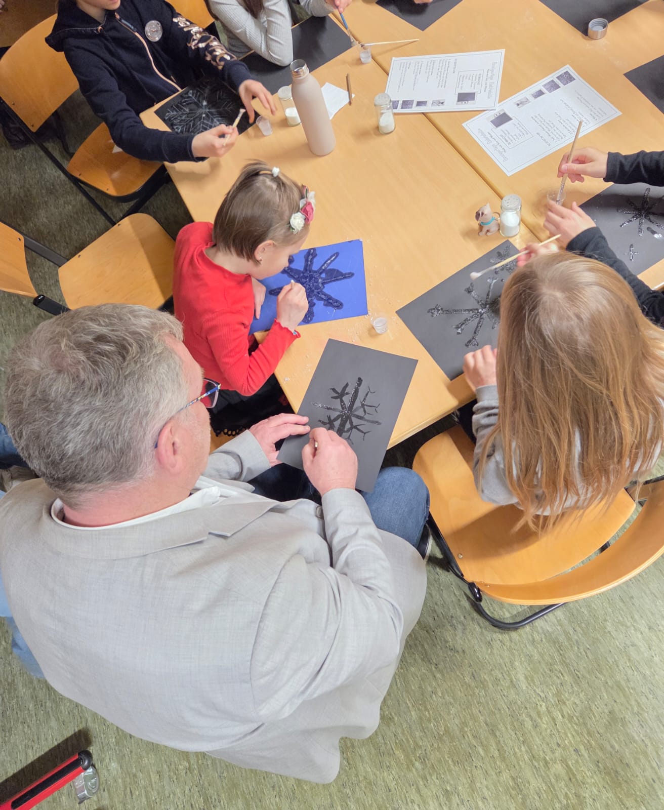 Im zweiten Stock warteten in verschiedenen Klassenzimmern abwechslungsreiche Stationen auf die Kinder. So bot Frau Buntrock in ihrem Klassenzimmer einen Tanzworkshop an. In der Klasse von Frau Lichtenstern präsentierten die Kinder ein Gedicht, außerdem konnten dort kreative Bastelarbeiten gestaltet werden. Frau Apression lud zu einem kleinen Winterquiz ein, das im Werkraum stattfand. Besonders großen Andrang verzeichnete die Station von Frau Braungart, an der die Kinder eigene Vogelfutterrollen basteln durften. Die Klasse von Frau Mahurin unterstützte die Kinder an einer kreativen Station, bei der Schneekristalle mit Salz und Wasser gemalt wurden.